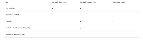 The image below details who is able to use the Microsoft nonprofit license within a nonprofit organisation. It includes grant offers, discounts and volunteer benefits. The type of Microsoft license available to nonprofit employees depends on their role and status within the organisation.